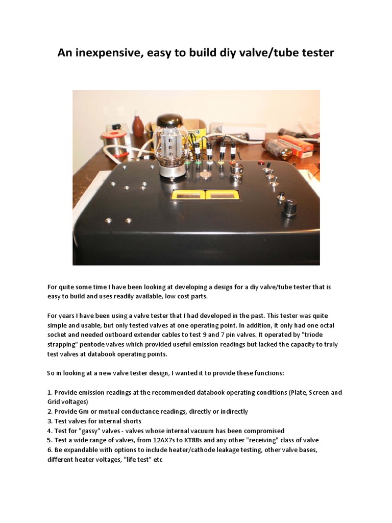 We also need interrupting switch because the pot (100k or 50k) will discharge the cells. 5 out of 5 stars. Google > the sussex homebrew valve tester i have ordered the needed parts and hope to have a working unit with in a month. Oct 31, 2015 likes received: For this the gm test is the most important.